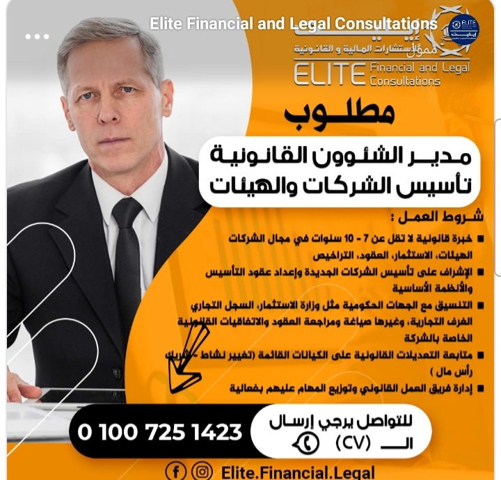 مطلوب مدير شؤون قانونيه تأسيس شركات الهيئات